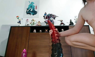 Ultra-kinky girl attempts to ride dildo of incomprehensible size with her tight pussy