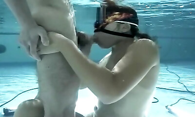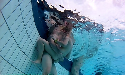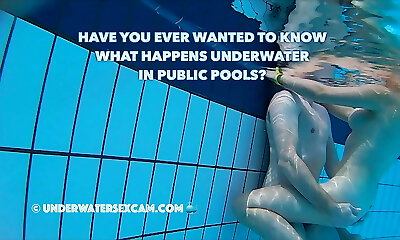 Real couples have real underwater hook-up in public pools filmed with a underwater camera