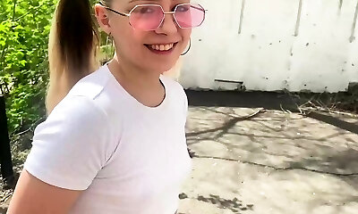Schoolgirl tearing up on porch, jism squirted all over.