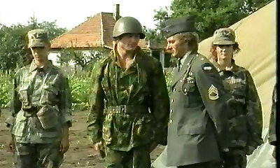 Ugly brunette Major Dita gives double bj to two kinky soldiers in MMF sex clip